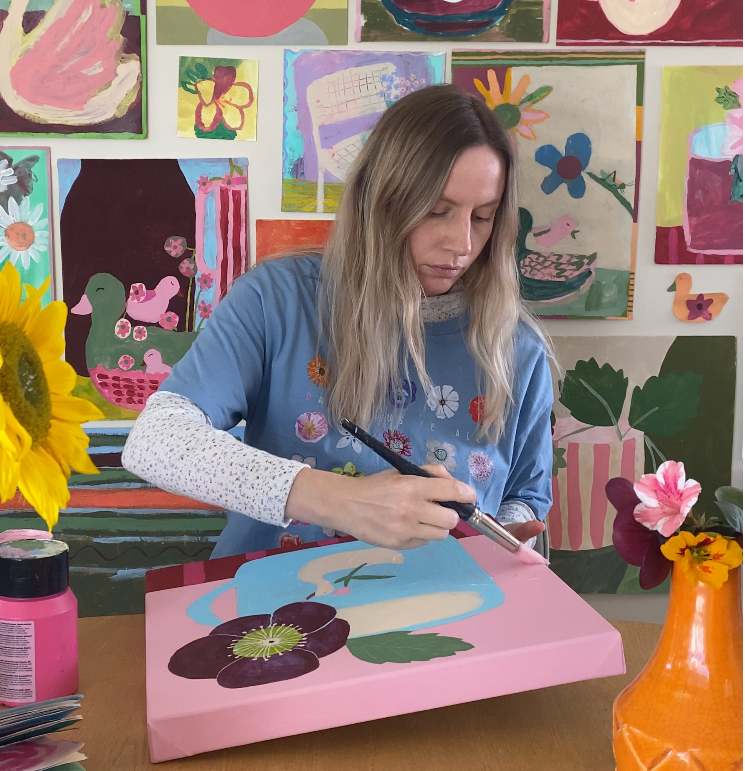 The ideas for Crystal’s playful and colourful paintings are often sparked by a trip to a vintage store or a walk in nature. She uses acrylic paint to create her layered works, embracing wobbly lines and the perfectly imperfect.