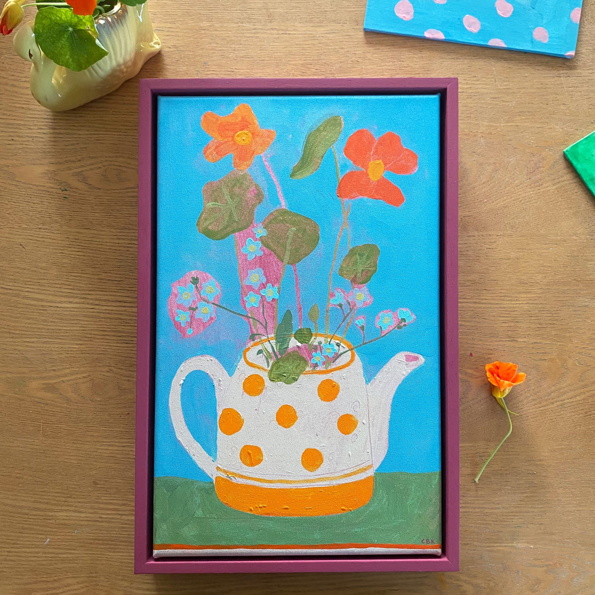 A cheerful still life blooms from the vege-patch in a polka-dot teapot turned garden. Bright orange and coral flowers